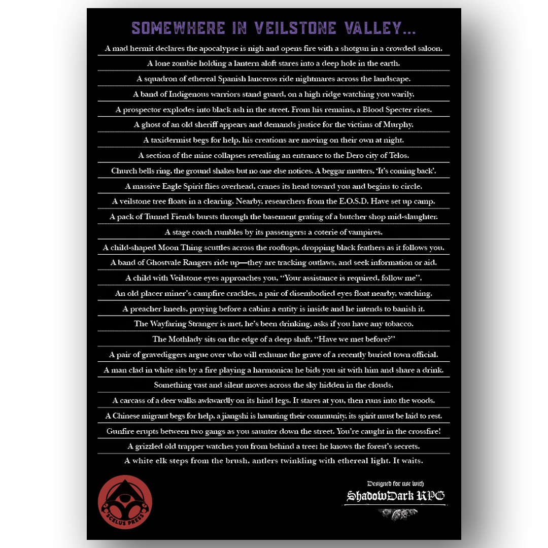 Veilstone is a Gothic Western setting for Shadowdark where gold rush greed tore open the Veil between life and death, unleashing curses, spirits, and horrors across a haunted valley. Step into the boots of gunfighters, scouts, doctors, and spirit guides to duel cultist outlaws, bargain with ancient powers, and survive a dark frontier where every shadow might pull you across the threshold into the plane of death.